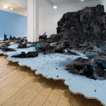 C’est un amalgame d’histoires, d’identités et de symboles dont il est lui-même issu, qu’il met en abîme à travers des sculptures et des installations souvent monumentales et toujours surréalistes. Le souvenir du sable noir de la baie de Matavai, « son onctuosité et sa couleur au couchant » évoque-t-il, est le point de départ de ses œuvres, réalisées à partir de cette matière inhabituelle ensuite mélangée à de la résine. Ses créations artistiques résultent de l’interprétation des symboles et des clichés polynésiens, inventant de nouvelles relations avec eux, jouant de leur sens et de leur impact et réécrivant ainsi une nouvelle iconographie polynésienne.