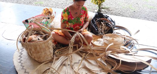 « Mes parures sont directement inspirées du souvenir que j’ai de mon père réalisant des couronnes de kikipa – ici on appelle ça le metua pua – pour les mariés. J’ai commencé à faire des expérimentations sur la nacre, sur du bois, essayé d’associer les essences. Il y a des colliers en nacre où j’ai voulu montrer la feuille en relief. Au départ, je voulais que mes feuilles soient les plus réalistes possible, mais au fil du temps, j’ai commencé à les styliser. Et pour finir, je m’attaque à la broderie sur nacre.»