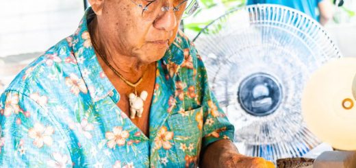 Elle en est encore toute contente. Les derniers ateliers qu’elle a animés ont été un vrai succès : « Cinquante-six personnes étaient présentes !, raconte-t-elle, ravie. Ça me conforte dans l’idée que les gens sont intéressés et veulent apprendre. C’est important de voir des gens s’attacher à notre travail. » Tous ces participants étaient venus à la Maison de la culture pour apprendre le tressage du pandanus et fabriquer un panier marché avec Fabiola Tupana. Si elle aime tant ces moments, c’est qu’elle n’a pas eu cette chance d’avoir un professeur. Ses grands-parents paternels sont des Australes et sa grand-mère vivait du tressage à Rurutu ; malgré les demandes de sa petitefille, pas question de le lui enseigner. Si Fabiola veut connaitre ce savoir-faire, elle doit se débrouiller toute seule. « J’avais envie d’apprendre mais je ne savais où aller. » Elle laisse tomber pendant plusieurs années et se met à la couture, mais on lui fait la même réponse : « Mes deux tantes couturières ont refusé de m’aider. Elles m’ont dit de prendre une robe, de tout découdre et de refaire toute seule. Je ne les ai pas écoutées, j’étais très déçue et fâchée. » Mais cette fois, elle s’accroche. Elle achète des mètres de tissu à bas prix et commence à coudre, seule. Elle se débrouille et finit par y arriver et devenir couturière. Alors qu’elle tient un stand à la mairie de Papeete qui organise une exposition des artisans en 2012, elle voit des mamies tresser et de nouveau son envie d’apprendre refait surface. « J’ai bien regardé, tout observé puis je suis allée acheter mon matériel et j’ai tressé. J’y ai passé la nuit mais j’ai réussi. » Le premier panier marché terminé, elle ne s’est plus arrêtée. Aujourd’hui, elle fait un peu de tout : couture, tressage, bijoux, tīfaifai… « Tous les savoir-faire que je connais, je les ai acquis seule. Je me suis débrouillée. J’aurais aimé que l’on m’apprenne. Quand je parle aux personnes âgées de l’artisanat, elles me disent que c’est de cette façon qu’elles-mêmes ont appris. » Mais ce n’est pas pour autant qu’elle approuve cette pédagogie à l’ancienne. Désormais, elle anime des stands et quand on lui demande d’apprendre, elle enseigne avec plaisir. « Je n’ai pas envie de refuser aux gens de transmettre un savoir-faire, ce que j’ai moi-même vécu. Mes grands-parents ne m’ont pas donné leur savoir-faire et c’est dommage. » Des choses se perdent… Fabiola voit bien certains artisans refuser de transmettre par peur d’être volés mais elle voit aussi l’importance, pour ces personnes venues apprendre, le travail qui se cache derrière une pièce. Elle rigole en repensant à ces élèves des derniers ateliers : « Pour certains, c’est difficile, mais pour d’autres, ça va tout seul. Je ne suis jamais fiu mais ce sont eux qui sont fiu de moi car je passe mon temps à répéter ! » Et sa grande fierté est d’avoir vu ces deux petites-filles animer les ateliers de tressage en nī΄au. Chez Fabiola, la transmission est bien assurée.