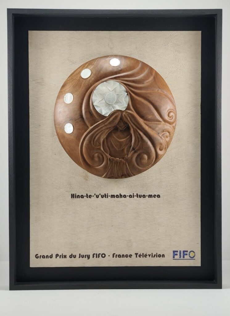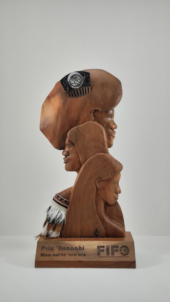 La ligne directrice de leur réflexion : rassembler les différents métiers du Centre autour d’une création unique — arts appliqués, gravure, sculpture, art numérique et tressage — tout en respectant le thème du festival, « Les femmes océaniennes », et en fédérant les talents des enseignants au sein d’une œuvre collective. Cinq œuvres distinctes ont ainsi été pensées, conçues et réalisées, chacune portant en elle une interprétation singulière de la femme océanienne. « On a opté pour une forme de dôme arrondi, symbole de protection, de matrice et d’élévation. Inspirés par la déesse Hina, figure majeure de la culture polynésienne et incarnation de la puissance féminine, nous avons ancré notre réflexion dans une dimension à la fois mythologique, culturelle et profondément identitaire. » Quatre de ces créations ont été mises sous cadre, à la manière d’œuvres d’art, afin de leur conférer une présence forte, assumée, presque muséale. À ces quatre œuvres s’ajoute un trophée volontairement présenté sur un socle, le trophée ΄Ananahi. Avec ces trois visages de femmes incarnant la richesse des identités, la transmission intergénérationnelle et la force du collectif, cette dernière pièce occupe une place particulière dans l’ensemble de la collection.